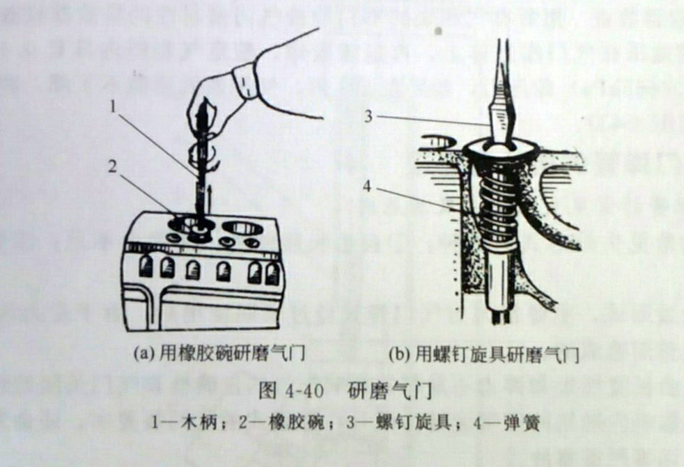 3、用橡膠碗吸住氣門頭,使柴油發(fā)電機(jī)組氣門往復(fù)旋轉(zhuǎn)進(jìn)行研磨,如圖4-40(a);若沒有橡膠碗,氣門頂有凹槽的,可在氣門桿上套一根軟彈簧,用螺釘旋具進(jìn)行研磨,如圖4-40(b)。